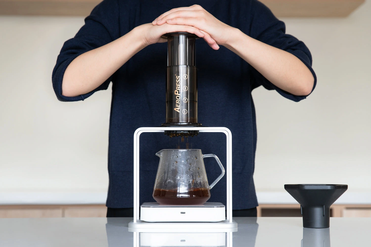 Using the Titan Brew Stand from Acacia for pour over coffee or with the AeroPress just makes sense. With an eight inch wide base, the Pearl series scales fit right on the stand — meaning the scale only catches the beverage weight. The Titan Brew Stand is made of aluminum alloy, so it can withstand even the downward pressure pushed onto an AeroPress. All in all, users will get an accurate extraction read.