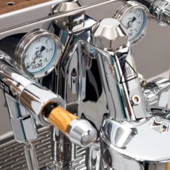 The olive wood accents replace the steam and hot water taps, E61 brew lever, and the single and double spout portafilters. Compared to the stock components, the olive wood portafilters are made from stainless steel as opposed to chrome plated brass.