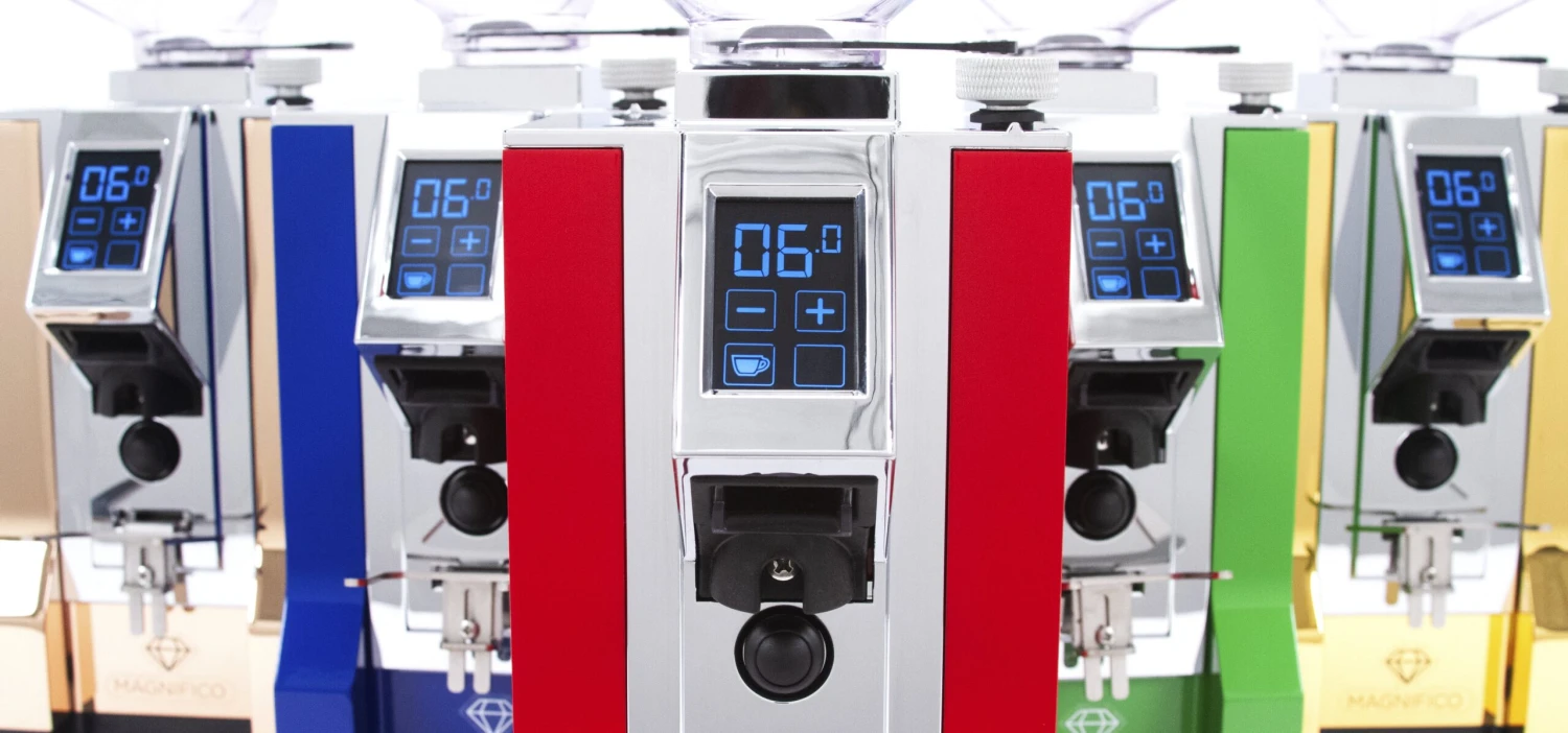 The Eureka Mignon Magnifico is an all purpose grinder with 55 mm flat hardened steel burrs that give it the highest output in Eureka’s Mignon range. Not only that, the Magnifico features specially designed “diamond inside” burrs which keep their edge for longer compared to stock burrs. The touch screen display is a stand out feature for a grinder so small, making adjustment as easy as it should be. With its larger burrs, the Mignon Magnifico can produce up to 1.8g of coffee per second for espresso, meaning it can produce a barista quality 18g double shot in as little as 10 seconds.