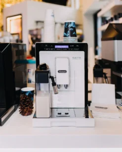 The DeLonghi Eletta Cappuccino ECAM 44660W features clean white paneling, programmable specialty brewing, and a modest price tag. The DeLonghi Eletta Cappuccino elevates the standards for home super-automatics. The intuitive touch metal display will have you programming custom one-touch beverages with ease while the Lattecrema system dispenses beautifully frothed milk for lattes, macchiatos, and more.