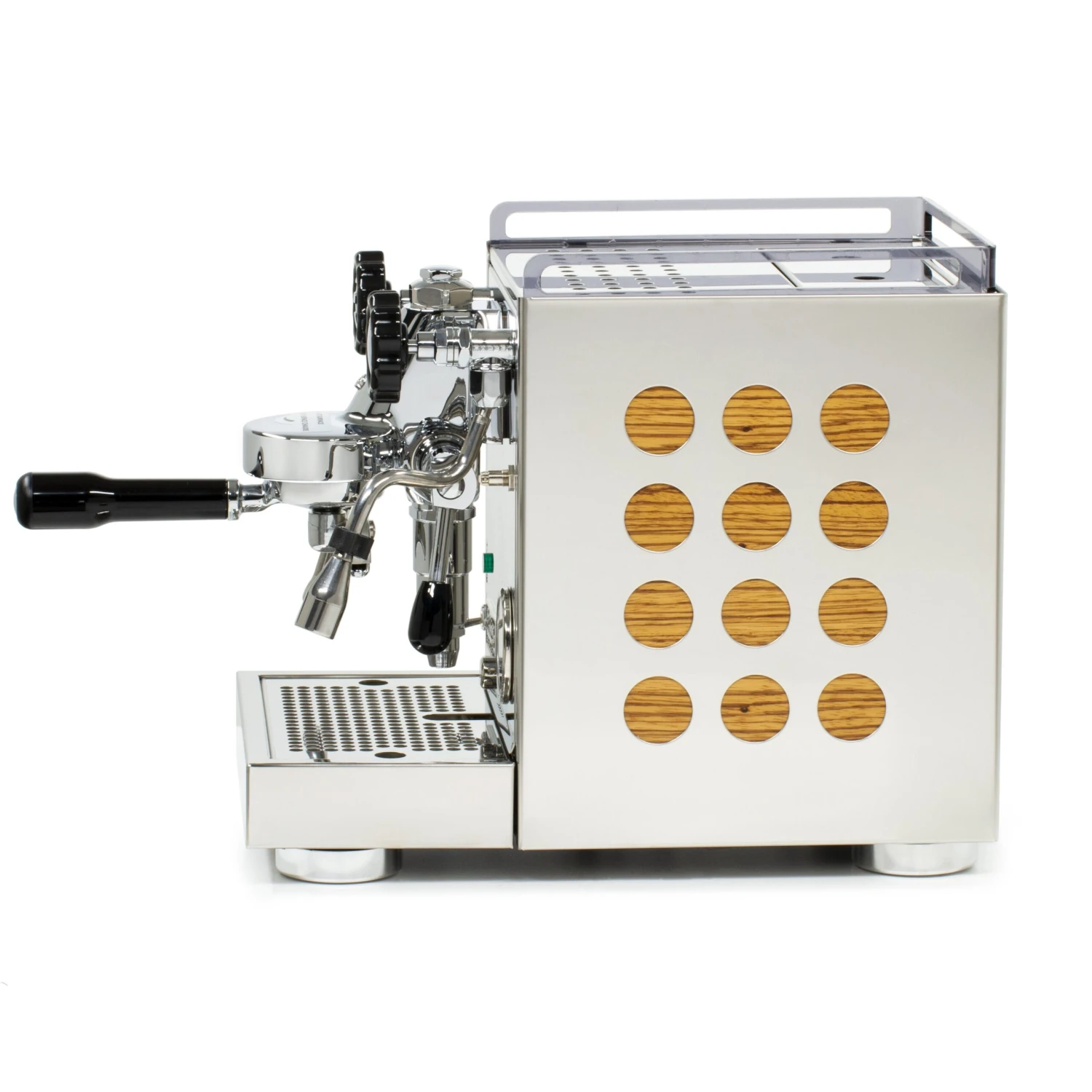 Rocket is a stickler for detail and the Appartamento really highlights that fact. Its hyper stylized steam and hot water knobs feature an easy grip gear design and Rocket’s iconic “R”; the wide feet resemble espresso pucks, and the laser cut side panels reveal a copper or white underbelly, all of which is rounded out by a striking mirror finish. Like any Rocket fan, we’re in love with the aesthetics on this compact machine.
